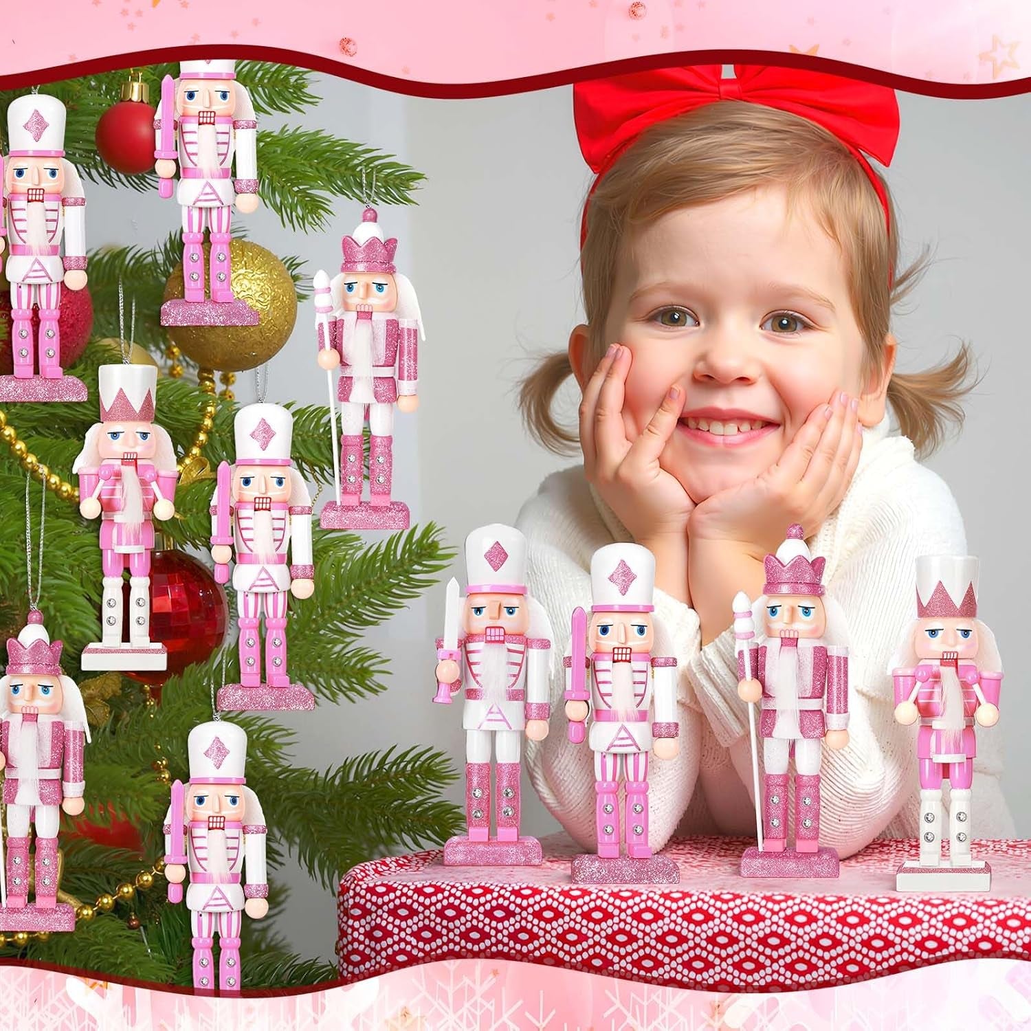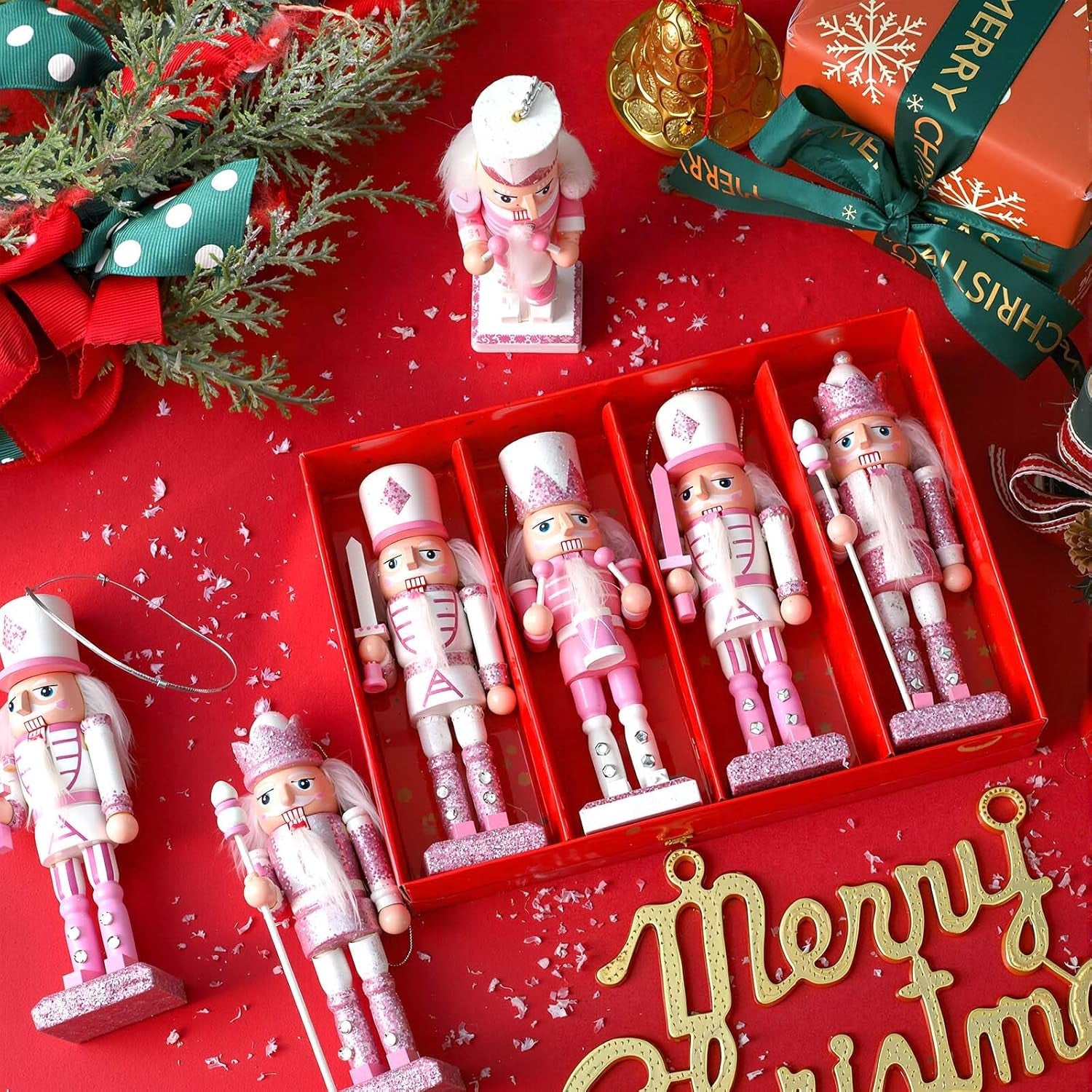 12-Piece Set of Pink and White Wooden Nutcracker Ornaments - 5-Inch Soldier Figures for Christmas Tree, Table Centerpieces, and Holiday Decor